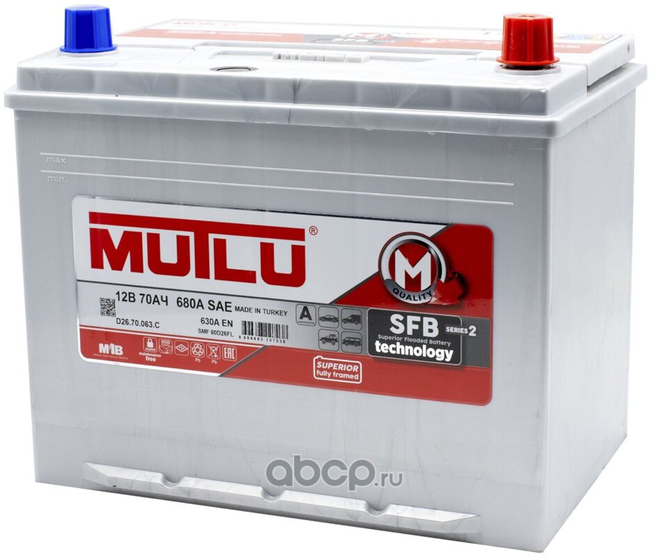 Аккумулятор MUTLU CALCIUM SILVER 70 А/ч ОБР SMF80D26FL 260x173x225 EN630